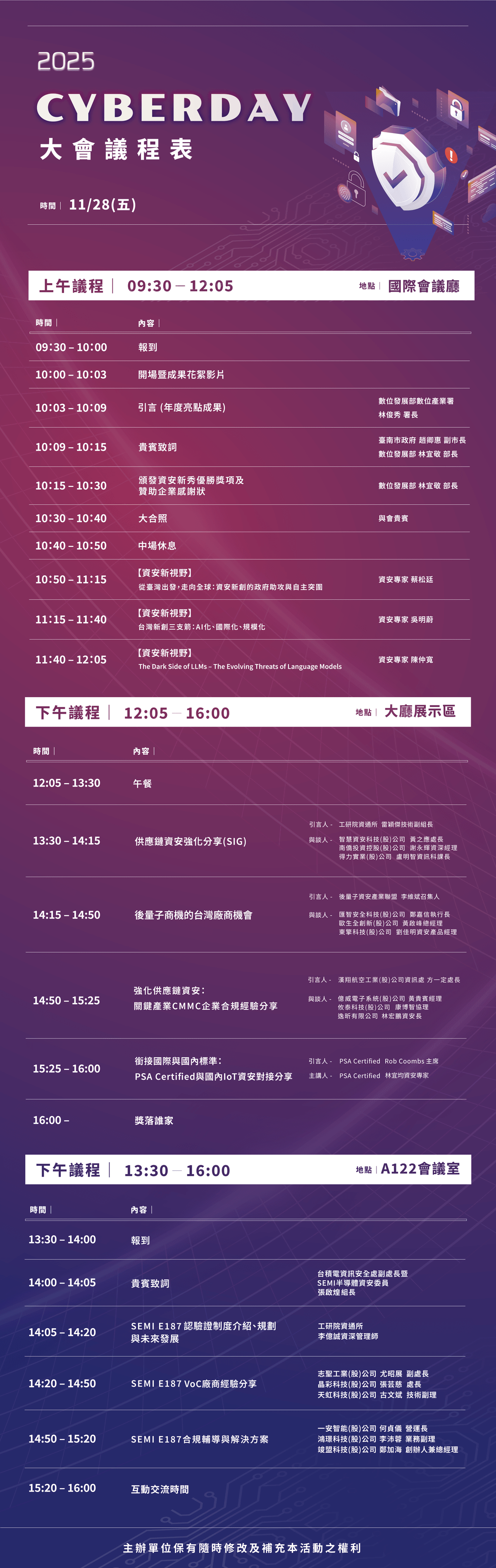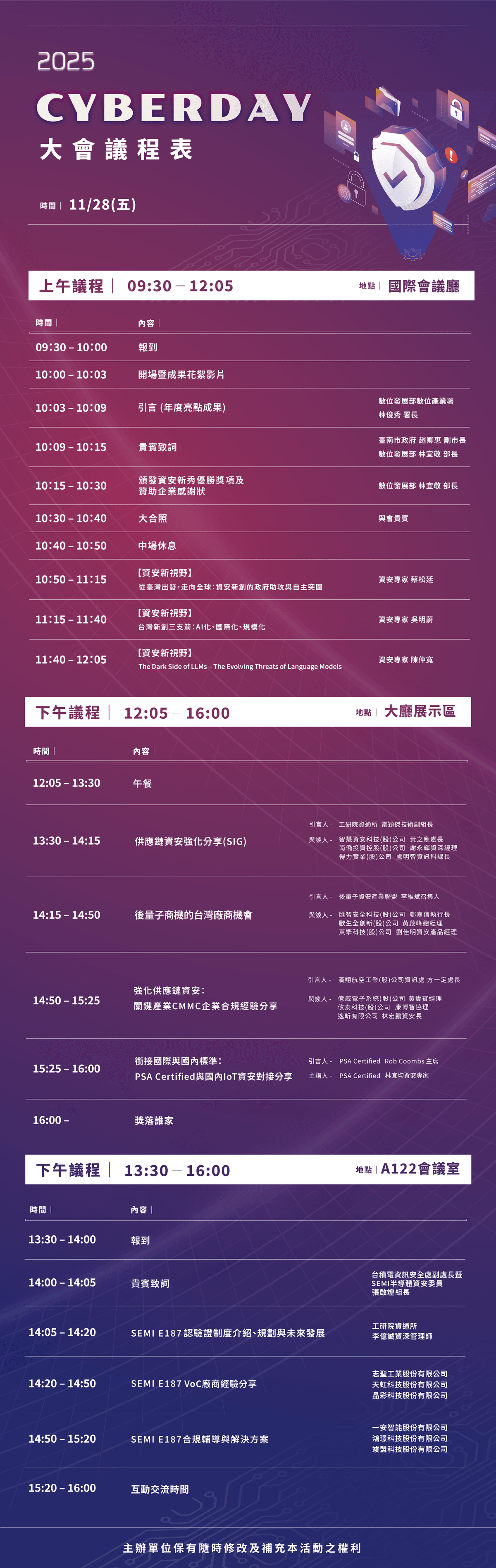 數位發展部數位產業署致力於推動臺灣產業數位轉型及發展數位經濟,協助產業因應數位挑戰提升資安韌性並強化產業資安防護,將於2025年11月28日(五)舉辦【CYBERDAY 2025 資安產業日】,藉以展示本署在資安產業、產業資安、資安人培、資安研發執行成果,並期許成為資安供給方、資安需求方的交流媒合平台,持續與資安的產、官、學各界共同合作,推動臺灣資安產業進一步發展。
