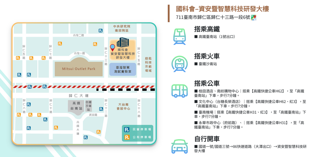 活動地點:資安暨智慧科技研發大樓 (臺南市歸仁區歸仁十三路一段6號)場地總覽
